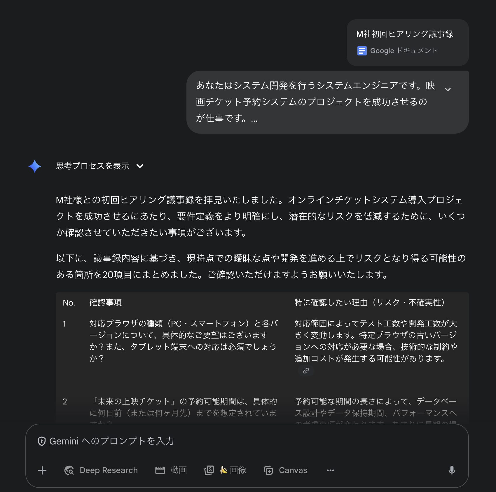 「考えられるリスクは何か」、「機能要件、非機能要件はどう整理されるか」といった問いを Gemini に投げかけると、プロンプトにもよりますが、かなり整理された内容が提示されます。これにより、新入社員は一人で悩む時間を短縮し、本質的な議論に集中することができました。