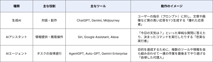 AIエージェント、生成AI(ChatGPTなど)、AIアシスタント(Siriなど)。これらの役割と能力には明確な違いがあります。