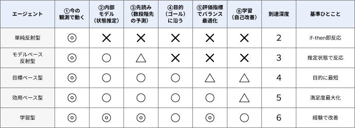 この章では、同一プロンプトに対し、AIエージェント5モデルが「どう解釈し、何を基準に行動を選ぶか」を比較します。内部モデル(状態推定)・目的・評価指標・学習の有無により、到達できるアクションの深さと、トレードオフ最適化の度合いがどう変わるかを一目で把握できます。