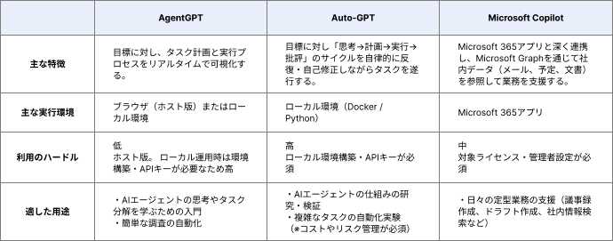 そのため、AgentGPTは「エージェントがどうタスク分解・反復実行するか」を体感する入門ツールとして適しているでしょう。より厳密な調査や業務利用では、結果の検証や追加のワークフロー設計を組み合わせるのがおすすめです。