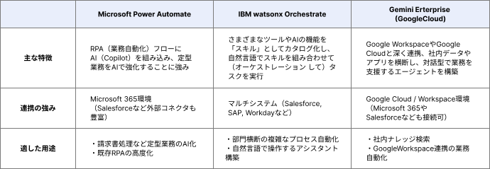 ここでは、本格的な業務自動化とDX(デジタルトランスフォーメーション)推進を支援する、代表的な有料AIエージェントツールを紹介します。まずは各ツールの強みと特徴を比較してみましょう。