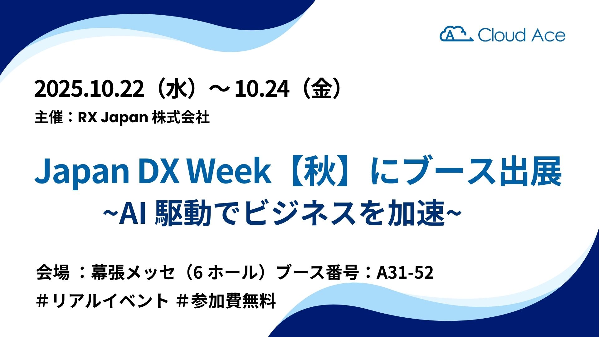クラウドエース(本社:東京都千代田区、代表取締役社長:吉積礼敏)は、2025 年 10 ⽉ 22 ⽇(水)から 24 日(金)まで、幕張メッセで開催される「Japan DX Week 【秋】 2025(AI・業務自動化)」に出展することをお知らせいたします。経営課題を解決する最新 AI ソリューションを展示し、「AI 駆動」によるビジネス変革をご提案します。