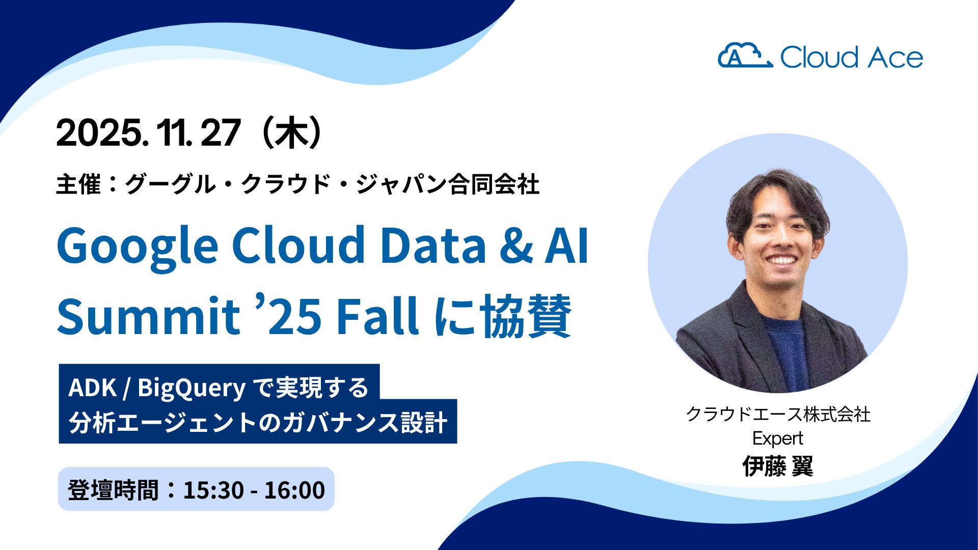 クラウドエース株式会社(本社:東京都千代田区、代表取締役社長:吉積礼敏)は、2025 年 11 月 27 日(木)に Google Cloud Data & AI Summit ’25 Fall (主催:グーグル・クラウド・ジャパン合同会社))に協賛いたします。 スポンサー セッションとして、弊社のエンジニアの伊藤翼が登壇し「ADK / BigQuery で実現する分析エージェントのガバナンス設計」についてお話します。