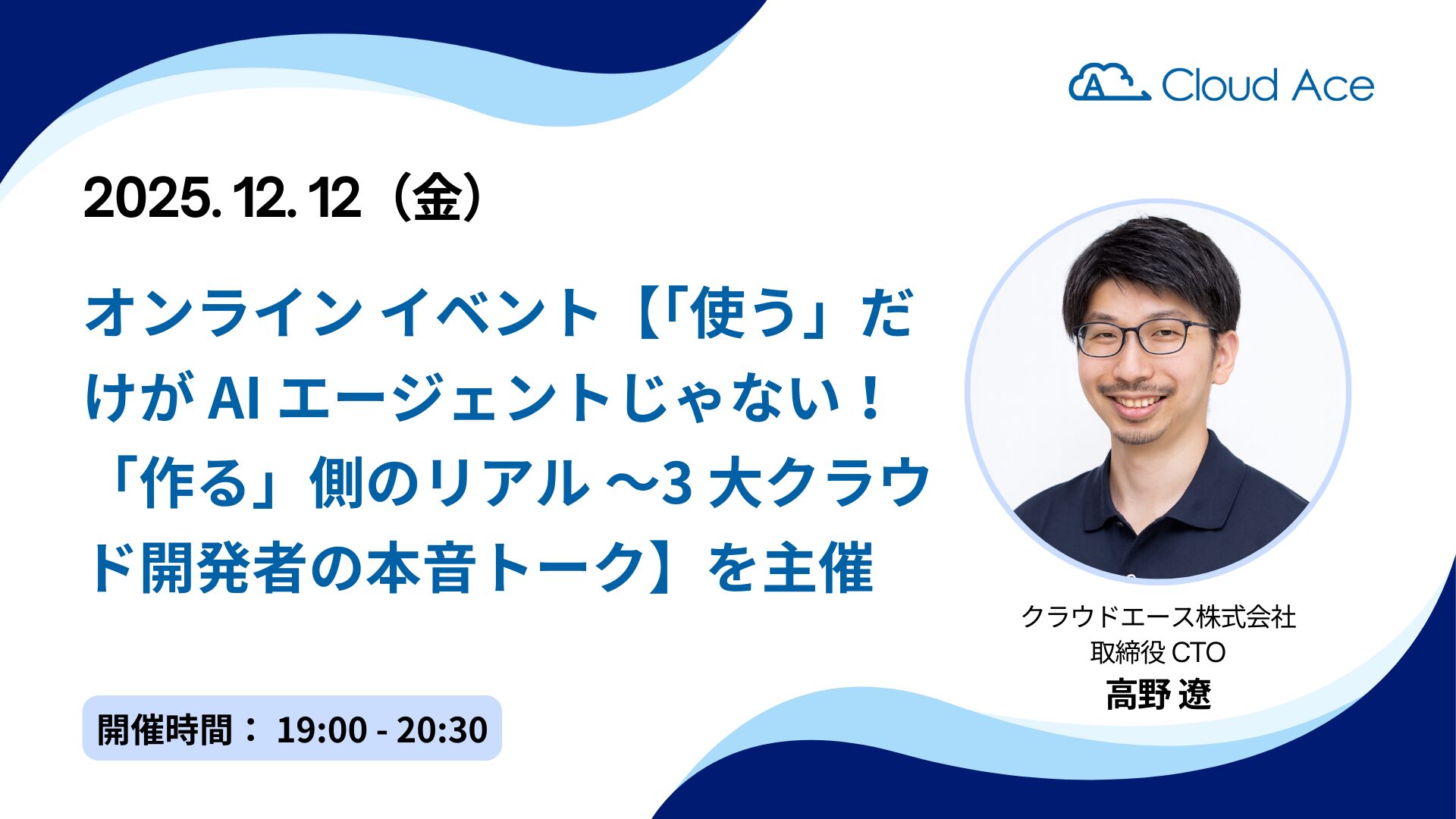 このたび、クラウドエース株式会社(本社:東京都千代田区、代表取締役社長:吉積礼敏)はオンライン イベント【「使う」だけが AI エージェントじゃない!「作る」側のリアル 〜3 大クラウド開発者の本音トーク】を主催し、取締役 CTO が登壇することをお知らせします。