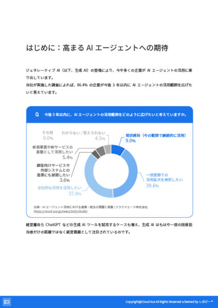 公開:2025年12月09日 お知らせクラウドエース株式会社(本社:東京都千代田区、代表取締役社長:吉積 礼敏、以下「クラウドエース」)は、解説ガイド「AI エージェント成功の分岐点|データプラットフォーム選び」を無料公開しました。 本ガイドは、生成 AI の普及により多くの企業が AI エージェント活用に乗り出す中、成果創出の鍵を握るデータ基盤の選択について実践的な視点で解説しています。解説ガイド、「AI エージェント成功の分岐点|データプラットフォーム選び」をダウンロードする: https://cloud-ace.jp/doc_download/turning-point-for-aiagent-success/解説ガイド、「AI エージェント成功の分岐点|データプラットフォーム選び」概要生成 AIの登場により、今や多くの企業が AI エージェントの活用に乗り出しています。当社が実施した調査によれば、86.4% の企業が「今後 3 年以内に AI エージェントの活用範囲を広げたい」と回答する一方、「既存システムとの統合・連携が複雑」(51.4%)、「複数のエージェントを効率的に連携させられない」(42.3%)など、導入後の課題に直面する企業が大半です。本ガイドでは、AI エージェントを本当に機能させるために不可欠なデータ基盤整備と、最適なプラットフォーム選択の考え方を提示します。 <この資料でわかること>AI エージェント活用における主要課題と解決の方向性 データ基盤が整わないと AI が機能しない理由 オンプレミス・AWS・Azure・Google Cloud の特徴比較 Google Cloud が AI エージェント活用に適する技術的理由 <こんな方におすすめ>AI エージェント導入を検討中の情報システム部門・DX 推進部門の方 データ基盤の選択に課題を感じている技術責任者の方 Google Cloud 活用を検討されている企業のご担当者様 AI プロジェクトの成果創出に悩む経営層・企画部門の方解説ガイド、「AI エージェント成功の分岐点|データプラットフォーム選び」をダウンロードする: https://cloud-ace.jp/doc_download/turning-point-for-aiagent-success/解説ガイド目次Chapter-1 AI エージェント活用における課題 Chapter-2 データ基盤が整わないと AI エージェントは機能しない Chapter-3 基盤選びの選択肢とそれぞれの特徴(オンプレ/AWS/Azure/Google Cloud) Chapter-4 AI エージェントの活用に Google Cloud が適する理由 Chapter-5 Google Cloud を使いこなすための壁 Chapter-6 Google Cloud のプレミアパートナー「クラウドエース」解説ガイド、「AI エージェント成功の分岐点|データプラットフォーム選び」をダウンロードする: https://cloud-ace.jp/doc_download/turning-point-for-aiagent-success/クラウドエースの Gemini Enterprise 導入・活用支援本ガイドで提唱する「データ基盤」と「AI」のシームレスな統合を実現するため、Google Cloud の企業向け生成 AIサービス「Gemini Enterprise」を活用した AI エージェント構築を包括的に支援します。 企業が直面する「既存システムとの複雑な連携」や「セキュリティ」の課題に対し、クラウドエースは Google Cloud プレミアパートナーとしての高度な知見を提供。ユースケースの策定から、Gemini を搭載した高精度なエージェント開発、さらには組織への定着・内製化トレーニングまでをワンストップで提供し、ビジネス成果に直結する AI エージェントの社会実装を加速させます。詳しくはこちら:https://cloud-ace.jp/service/gemini-enterprise/クラウドエース株式会社について本社 : 東京都千代田区大手町 1-7-2 東京サンケイビル 26 階 代表取締役社長 : 吉積 礼敏 ウェブサイト:https://cloud-ace.jp 事業内容:クラウドエースは Google Cloud の日本トップクラスの実績をもち、海外にも複数の拠点をもつシステム インテグレーターです。クラウドの導入設計や運用・保守、システム開発、生成 AI 活用までをワンストップで提供いたします。 Google Cloud 認定トレーナーが多数所属しており、高い技術力とサービス品質で、Google Cloud プレミアパートナーとマネージド サービス プロバイダ、Google Maps Platform のパートナーにも認定されています。製造、小売、情報通信、ゲームなどあらゆる業界において 1,000 社を超える顧客をサポートしてきた知見を活かし、ビジネスの成功に直結するクラウド活用を提案いたします。お問い合わせ先クラウドエース株式会社 広報担当 E-mail:pr@cloud-ace.jp※Google Cloud、Google Maps Platform および Gemini Enterprise はGoogle LLC の商標です。 ※AWS は Amazon.com, Inc. またはその関連会社の商標です。 ※Microsoft Azure は Microsoft Corporation の商標です。 ※IDEATECH、リサピーは株式会社IDEATECH の登録商標です。