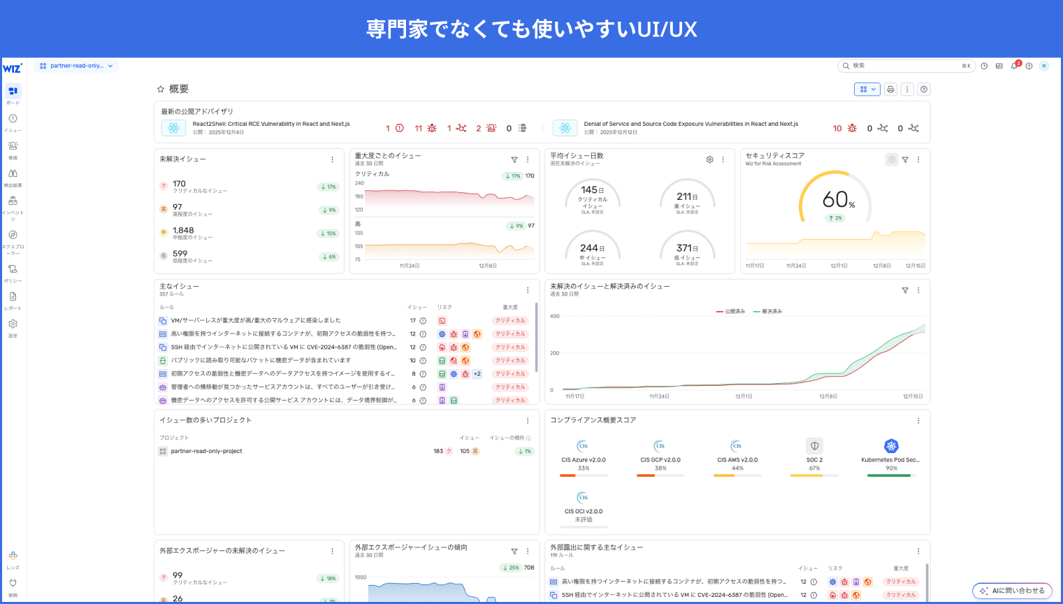 Wizは、CSPM(設定不備管理)やCWPP(脆弱性管理)といった、これまで個別のツールが必要だったセキュリティ機能を単一のプラットフォーム(CNAPP)に統合しています。開発から運用までのライフサイクル全体にわたり、セキュリティチーム、開発チーム、運用チームが同じ情報を元に連携できます。これにより、組織全体のセキュリティレベルを底上げし、迅速で一貫性のある対応文化を醸成します。
