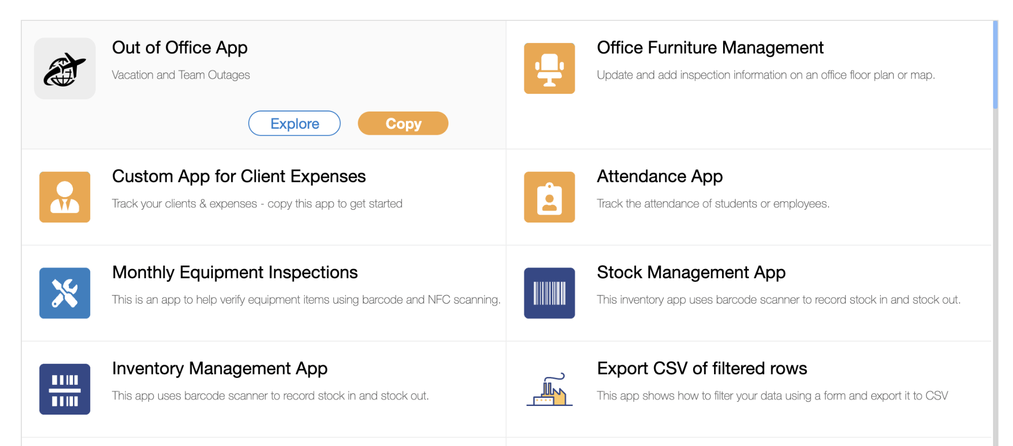 AppSheet はユーザ向けに様々なサンプルアプリを用意しています。ユーザはこれらのアプリケーションをコピーし、独自にカスタマイズを行うことができます。カテゴリ別に様々なサンプルアプリが存在するため、要件に沿ったアプリが見つかるかもしれません。App Maker も拡張可能なサンプルアプリを提供していますが、アプリの種類については AppSheet の方が豊富だと思います。