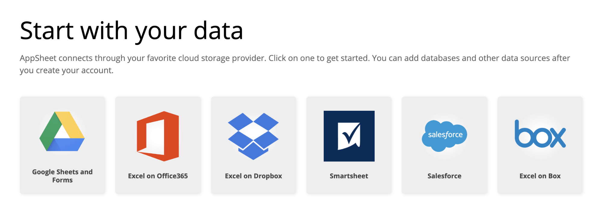 AppSheet は Google ドライブ やOffice365 上のExcel、Dropbox、Salesforce等、様々なサードパーティサービスに標準で接続が可能です。ただし、これらのサービスに接続するためには、もちろん各サービスのアカウントを持っていることが条件になります(OAuth認証によってユーザー権限で各リソースへの接続許可を行うため)。